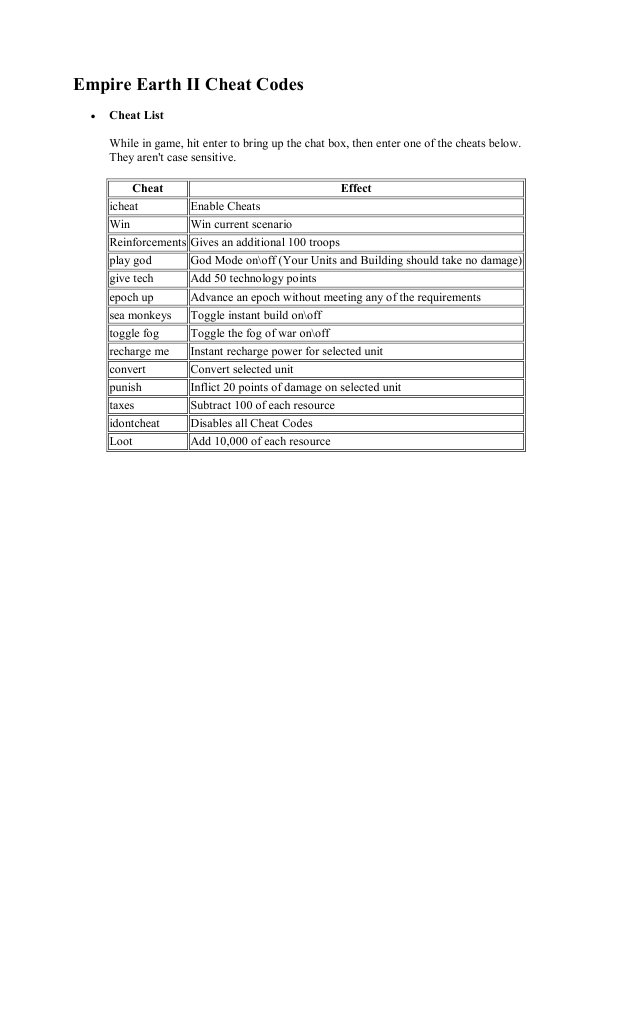 Cheat game empire earth 2. Cheats are invoked by using the chat box. Empire Earth 2 - Cheats-----by One_Dead_Angel. Play More Than 2500 Games Online.